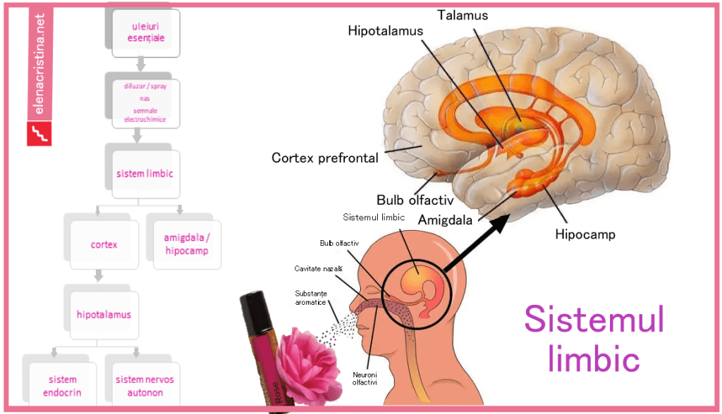 Accesul vaporilor din uleiurile volatile pe cale olfactivă este, conform cercetărilor, cea mai rapidă și efectivă rută în tratamentul unor probleme emoționale ca stresul și stările depresive (și câteva tipuri de dureri de cap) (Price, 2007). Aceasta, deoarece cavitatea nazală are contact cu creierul, prin nervul olfactiv ajungând în sistemul limbic, zona din creier care coordonează emoţii ca plăcerea, durerea, frica, tristeţea dar şi memoria de scurtă şi lungă durată, învăţarea, comportamentele. În hipocamp se întâmplă procesele care ne aduc amintiri stimulate de mirosuri, de tipul madlenelor lui Marcel Proust, citat antologic pe care îmi face plăcere să-l redau aici.