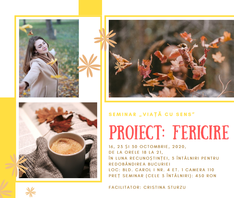Acestea sunt doar câteva elemente de bază care contribuie la starea noastră de fericire. Mai multe veți afla și exersa în întâlnirile noastre de vineri seara, de la seminarul de recunoștință. Pentru că da, un alt ingredient principal al fericirii este recunoștința.