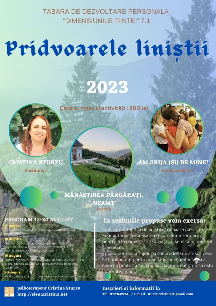 Tabara din vara 2023 poarta cu sine promisiunea liniștii. Deși orice întâlnire aduce si provocări la autocunoaștere si descoperire, ceea ce uneori poate fi destul de bulversant, pe ansamblu, la sfârșitul taberei toate experiențele sunt menite sa faciliteze recuperarea păcii, a recentrarii, a recuperării de sine.
